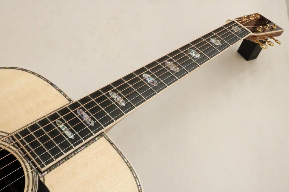 メイプルバインディングとスクエアヘッド、装飾パターンには68年、69年のD-45を思わせる渋谷オリジナルオーダー品