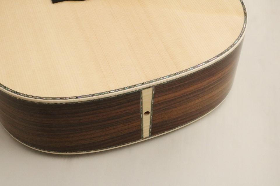これにより一本一本個性のある杢目になっていて、表の豪華絢爛なD-45に負けないくらいに後姿も魅力的なオーダー品に仕上がっています。
