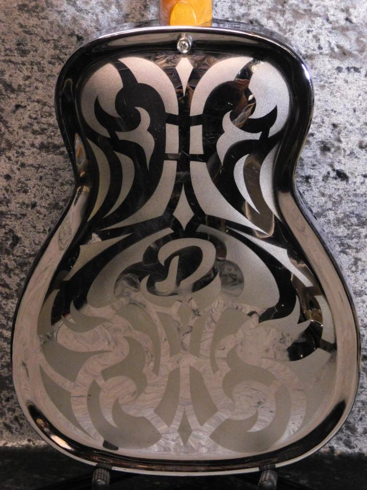 本器は良くあるヤシの木などのハワイアン模様ではなく、渋い唐草がサンドブラストで描かれ、ボディバックのD模様も印象的なモデル。