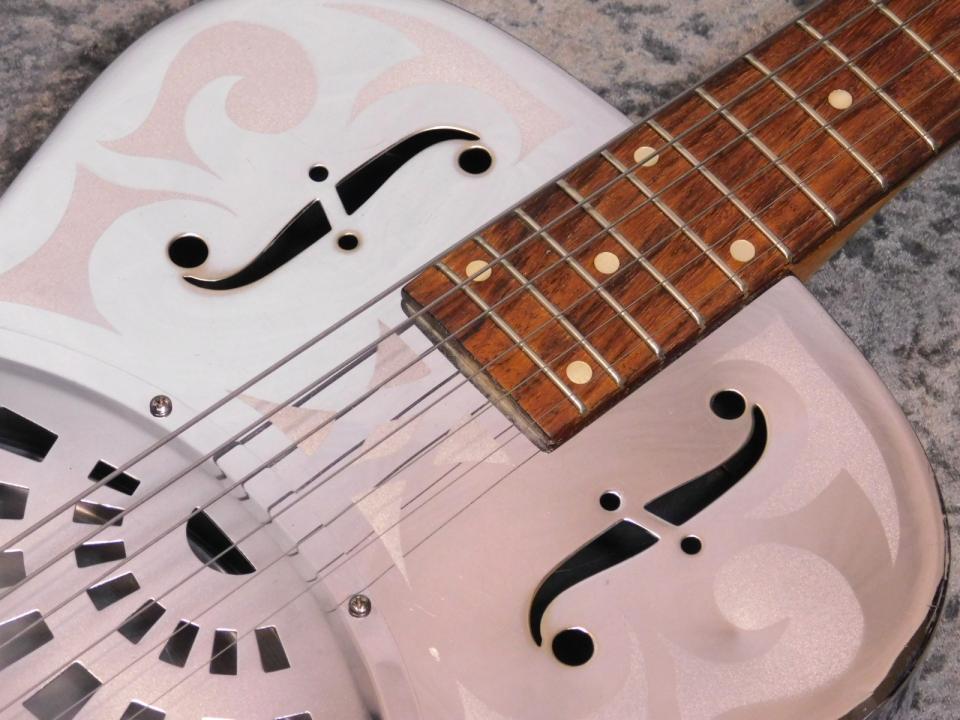 この時代のUSA製ドブロは生産本数こそ少ないものの評価が高く年々手に入りにくくなっています。Fホールが細身なのが特徴です。