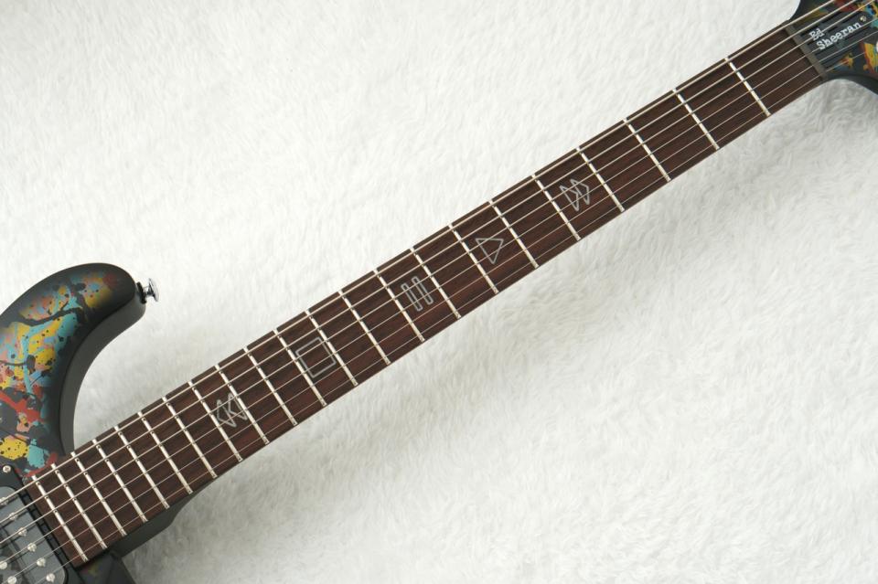 ボディの「Cosmic Splash」アートワークに加え、指板インレイには再生・一時停止・巻き戻し・早送り・停止といった「プレイヤー・アイコン」を採用。