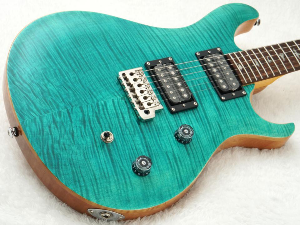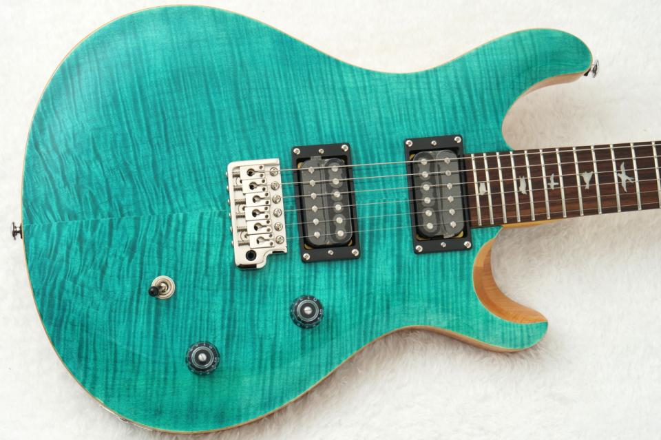 ターコイズの鮮やかなカラーが杢目を引き立てるSE CE 24。ボルトオン構造ならではの立ち上がりの速さと、サテン仕上げネックの快適な演奏性を兼ね備えた一本!