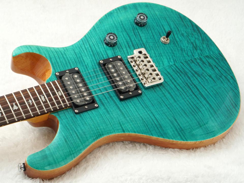 ターコイズの鮮やかなカラーが杢目を引き立てるSE CE 24。ボルトオン構造ならではの立ち上がりの速さと、サテン仕上げネックの快適な演奏性を兼ね備えた一本!