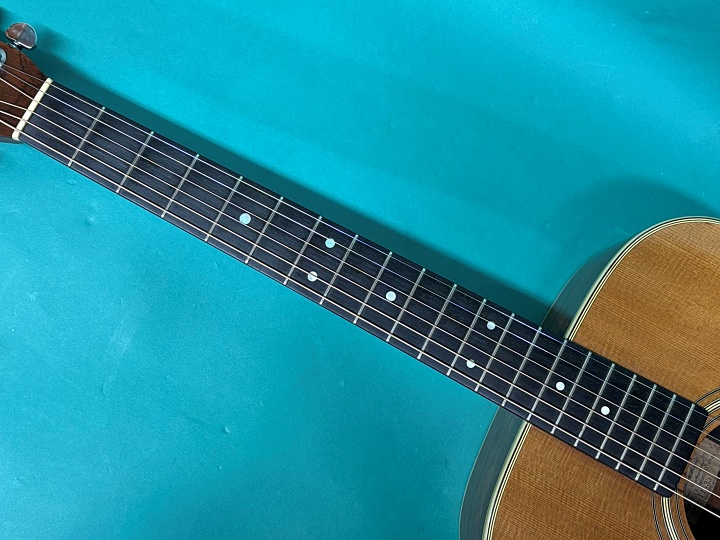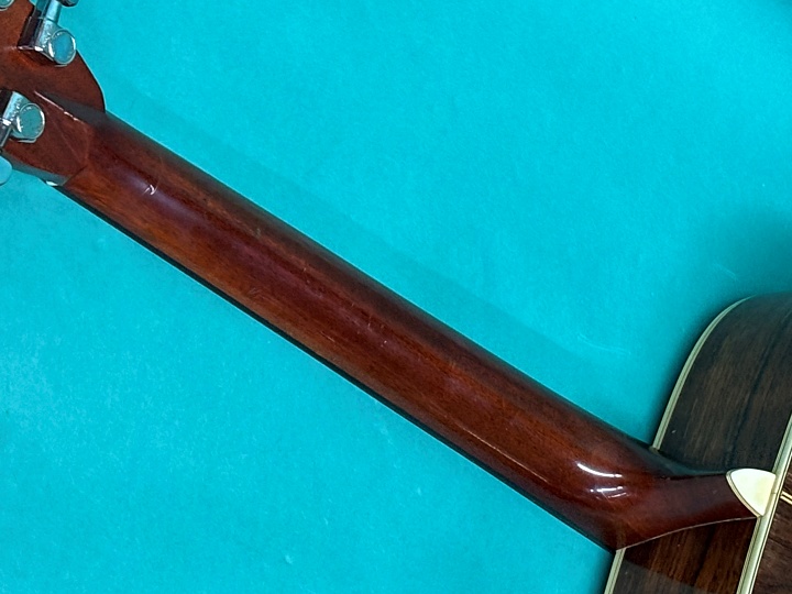 12フレット上の弦高は6弦2.4mm、1弦1.8mm。調整も行き届いており、弾きやすくセットアップされています。ストローク、フィンガースタイルともに演奏性の良いアクションです。アジャストロッドは固着しており締めしろはいっぱい気味ですが、ネックは真っすぐで良好なため、将来的な心配は少ないと思われます。フレットも十分に残っています。