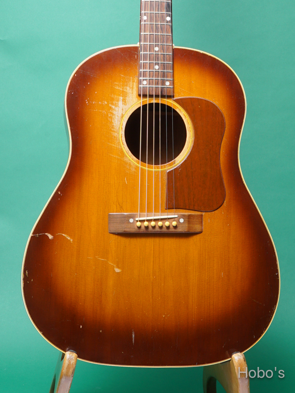 本ギターは1947年から1961年まで製造されたランドショルダーモデルで、中古市場において流通の稀な逸品です。最大の特徴はギブソン社製のボディに、ナショナル社製の独自のボルトオンネックが取り付けられていること。ボディはギブソン製なので、50年代前半らしい、太いウッド感がある迫力のあるサウンドですが、ボルトオンネックや金属パーツにより、ジャキッとした歯切れの良い高音域が特徴となっております。製作から70年以上の長い歳月を経過したことによる円熟のサウンドは、指で弾けば広がり、ストローク時には迫力があり、湧き上がるような乾いた出音はまさに格別。近年式にはない乾いたコード感と、ウッディな音色が際立った素晴らしいヴィンテージサウンドに仕上がっております。鳴りの良い個体をお探しの方や人と被らないギターをお探しの方には特におすすめで、ヴィンテージサウンドの魅力を存分にご堪能して頂けることでしょう。