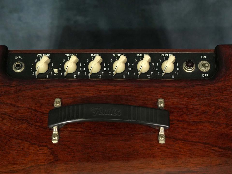 Volume(GAIN)・3-Band EQ・Master Volumeに加えてスプリングリバーブも内蔵し、さらに「FAT」スイッチによってコンパクトなコンボアンプながらクリーン~オーバードライブまで幅広い音作りが可能な事で、数あるFenderアンプの中でも自宅練習~スタジオで使える手軽なチューブアンプとして高い人気を誇るBlues Junior。