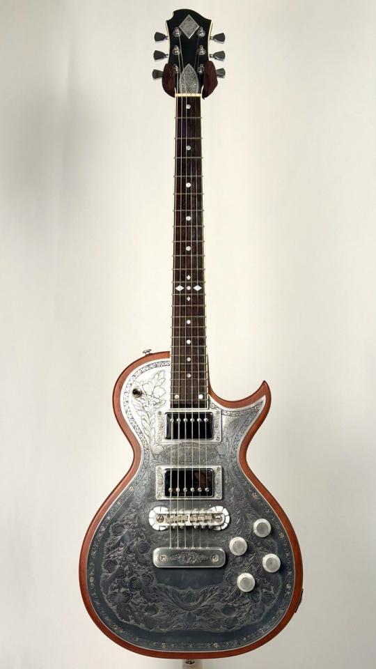 おおきなくびれを持つボディとメタルプレートの装飾が目を引く一本です。
