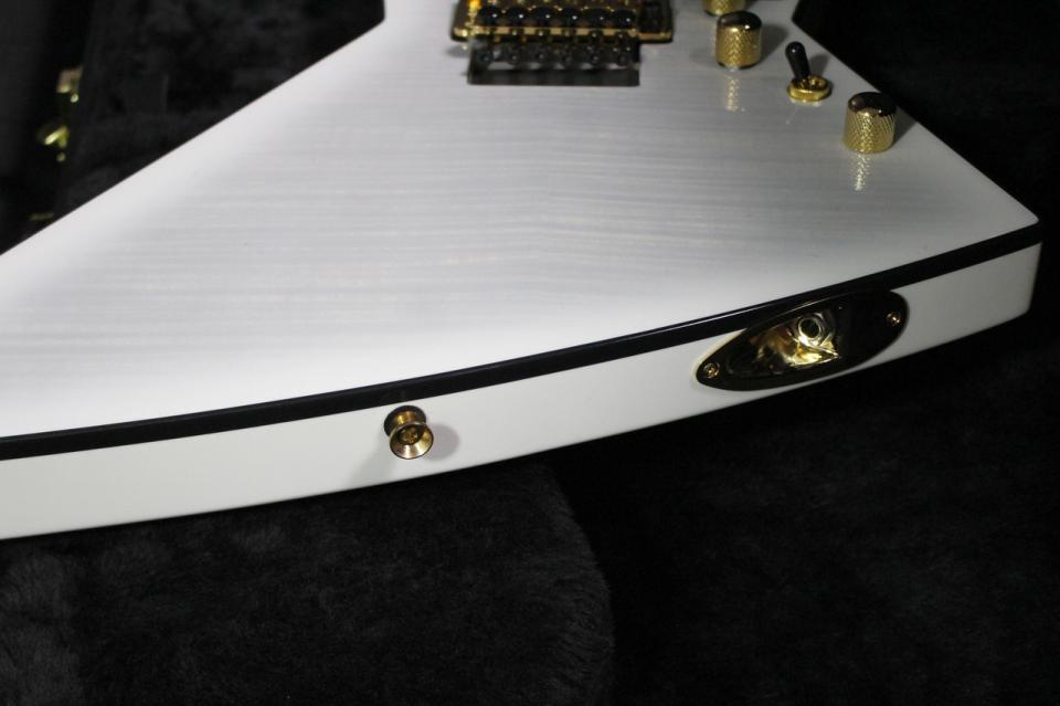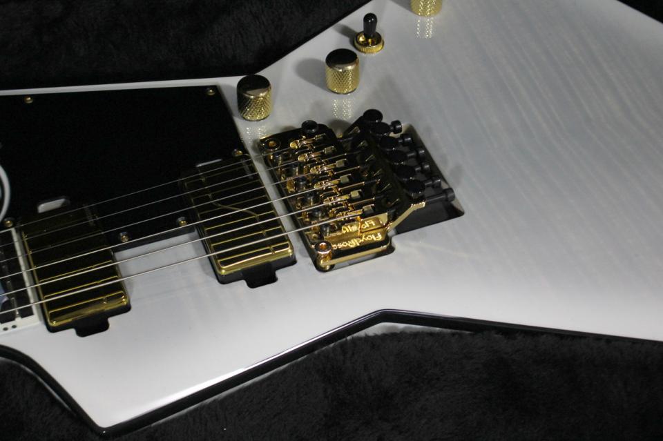 フレイム・メイプルの杢目が映える “ゴースト・バースト” フィニッシュにゴールド・パーツを纏った優美な意匠と、アグレッシブなメタル・サウンドを併せ持つ最高に美しいモデルです。