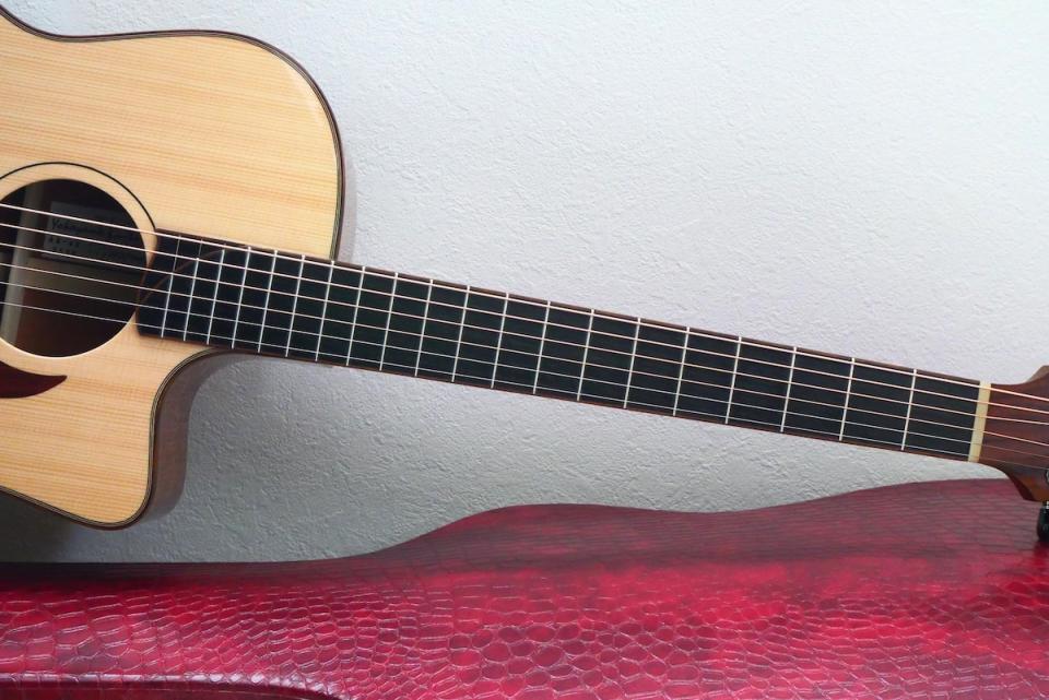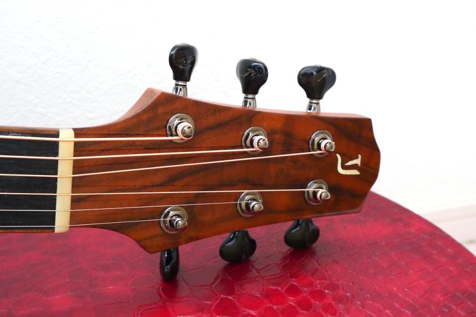 ヘッド天神にはウォルナット、ロゼッタにはマダガスカルローズウッドを採用し、ロゴには白蝶貝、バインディングにはオバンコールをチョイスしています。