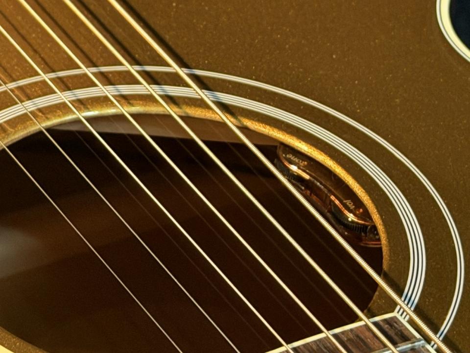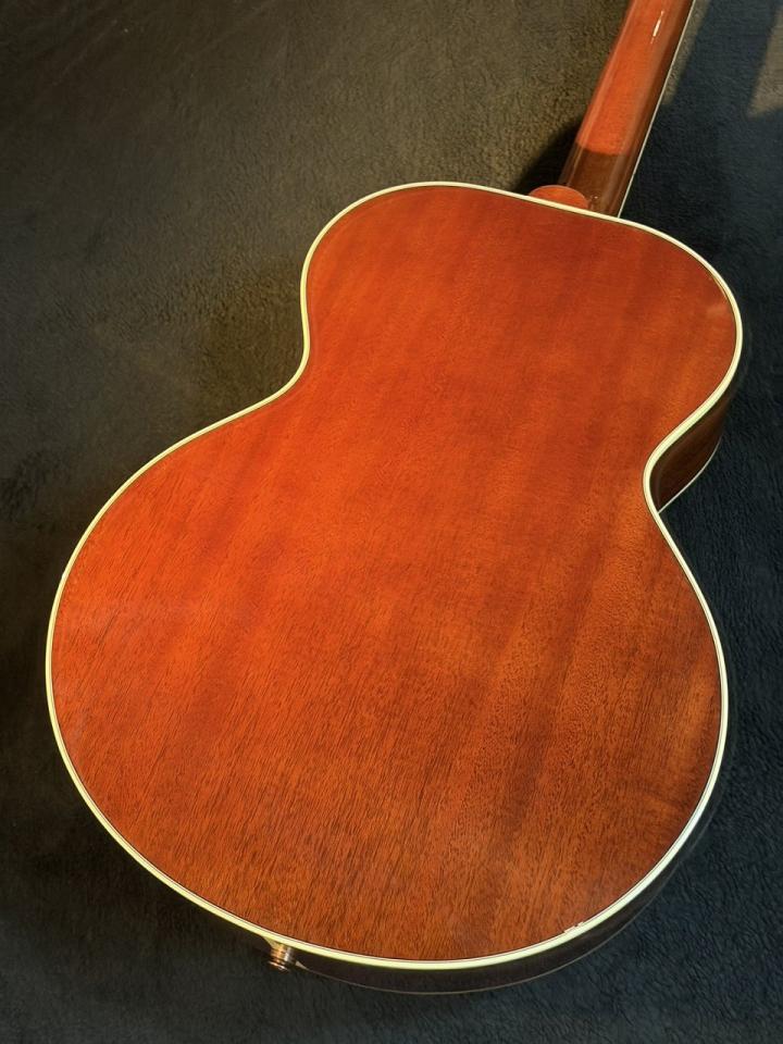 J-200より一回り小さい16インチボディ。オリジナルJ-185のサイド&バックはメイプルで構成されていますが本モデルはマホガニー。マホガニーらしい優しさとストレートな出力でとても歌に合わせやすいモデルに仕上がっています。