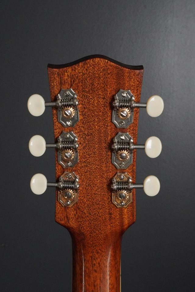 チューナーはクルーソンのプレステージシリーズ、オープンバックでアウトラインの入ったレトロなペグをチョイスしました。3連ではなく、サザンジャンボですので3こ独立したタイプとし、テーパーの付いたヘッドと合わせて、この感じですと40年代後半風のすこしレトロなスタイルですが、良い雰囲気でしたので、あえてこのオープンスタイルを選んでみました。