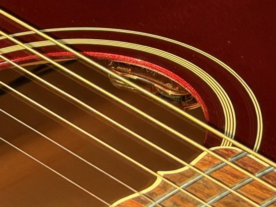 17インチとGibsonアコースティックモデル最大サイズのSJ-200ですが、クビレが深いので抱えてみますと正面から見て感じる印象程大きくは感じないと思います。