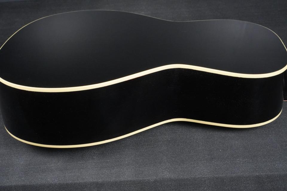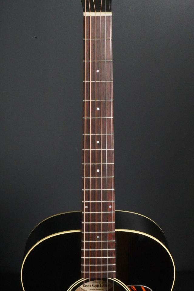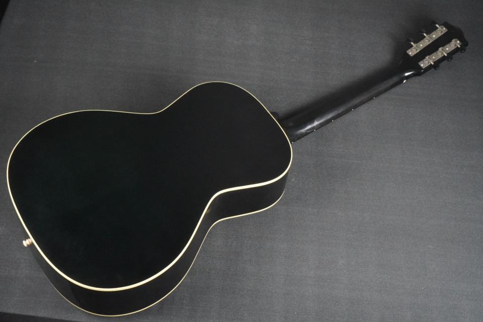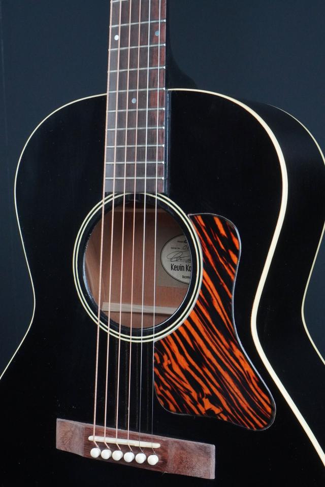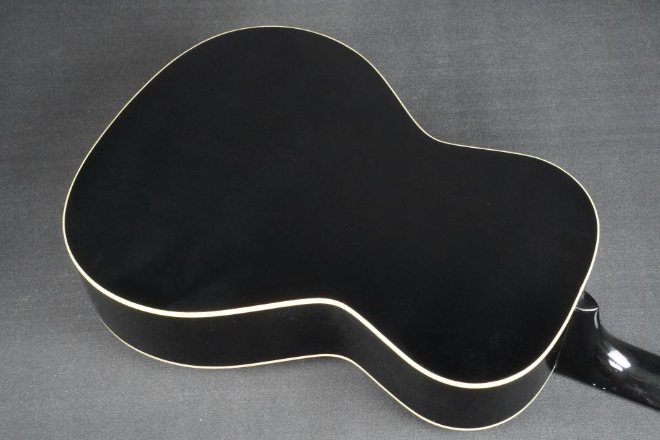 1930年台初頭、スティール弦のアコースティックギターも14フレットジョイントとなり、だんだんと仕様が安定してきた頃の小柄なモデルをモチーフに、ヴィンテージでは見かける事も多い、ブラックカラーでファイヤーストライプのピックガードというスペックでカスタムオーダーした、ショップオリジナルモデルの新作です!