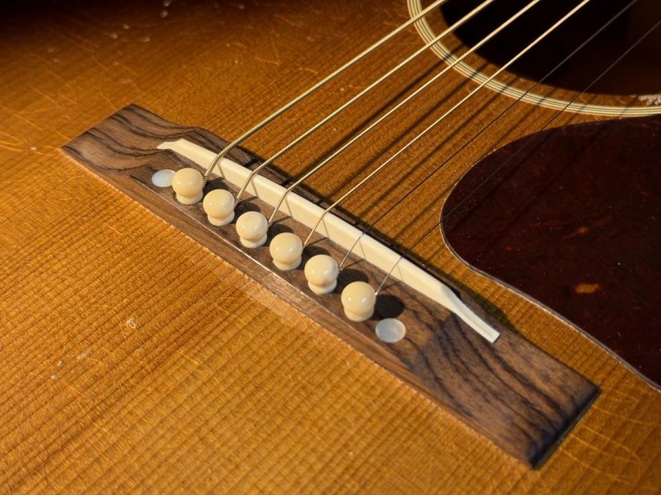 新製品「マーフィー・ラボ1942バナー J-45」は、ヒストリック・スタイル・バースト色でハンドスプレーされたサーマリー・エイジド・アディロンダック・レッド・スプルース・トップ、より良い鳴りとレスポンスの実現のためニカワで接着されたボディ・トップ・ブレーシング、そしてボーンナットとボーンサドルといった贅沢な仕様の数々を誇ります。