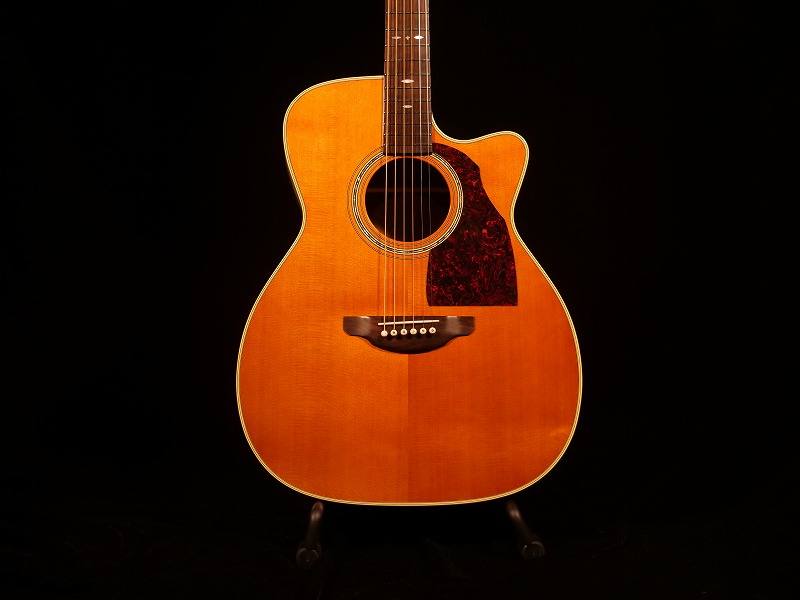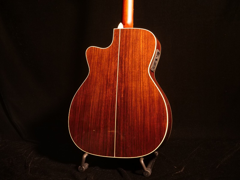 ボディサイズは胴厚のあるシェリーオリジナルボディーにカッタウェイが施されています。トップにシダー単板、バック&サイドはローズウッド合板、ネックマホガニー、指板・ブリッジはエボニー、鼈甲柄オリジナルピックガード、シャーラータイプGOTOH製ペグ、本アバロン貝ロゼッタ、ノンスキャロップドブレーシング(僅かに6弦側のみスキャロップ加工)、645mmスケール。