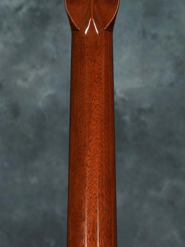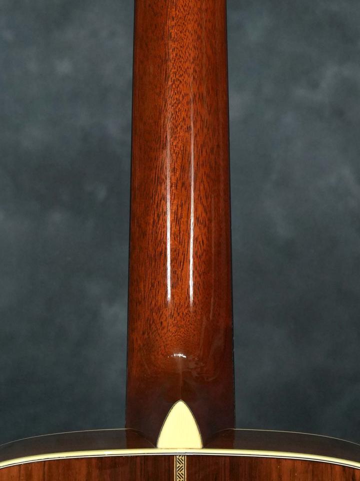 シトカスプルースTop&Brazilian Rosewood(ハカランダ) Side/Backのオーディトリアムボディ、スキャロップされたブレーシング、ナット幅45.1mm(実測値)かつソフトなVシェイプのマホガニーネック、エボニー指板、スロットサドルのエボニーブリッジ、回し心地の良いWaverlyチューナー。