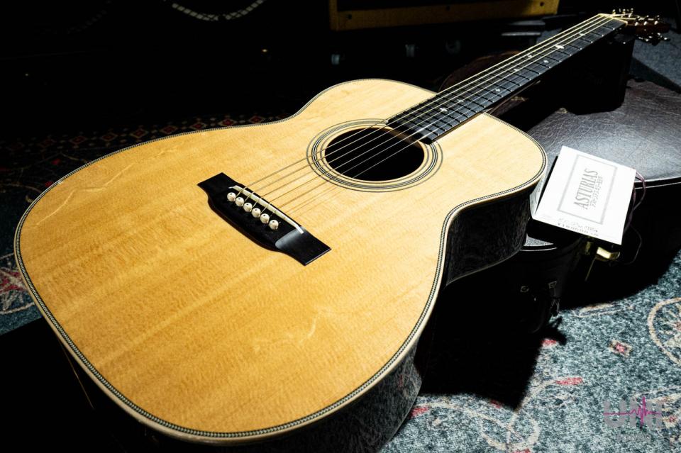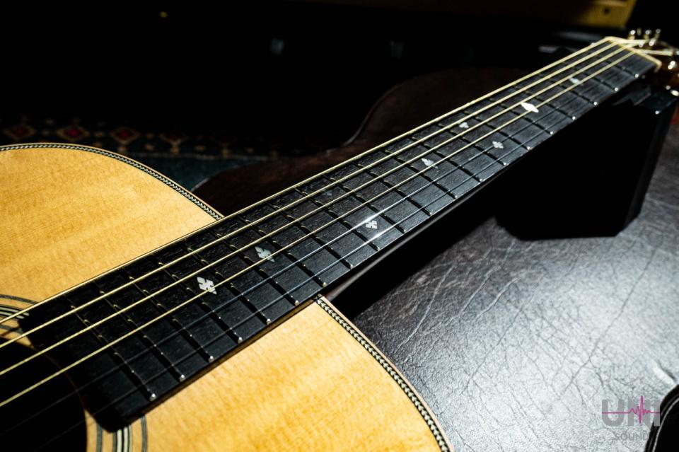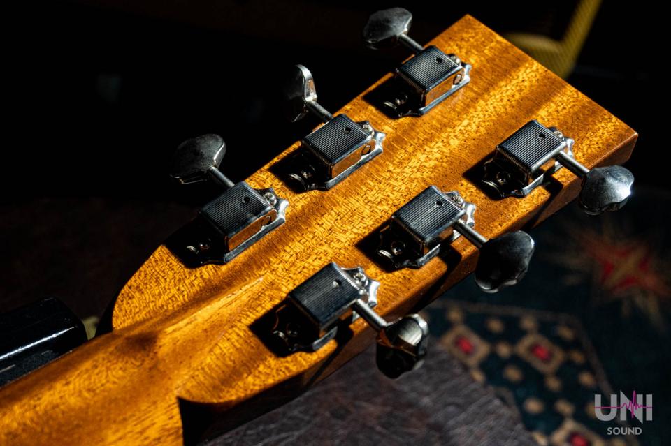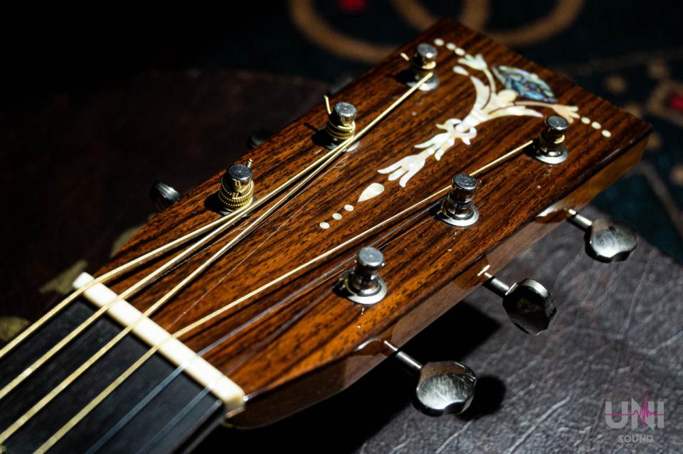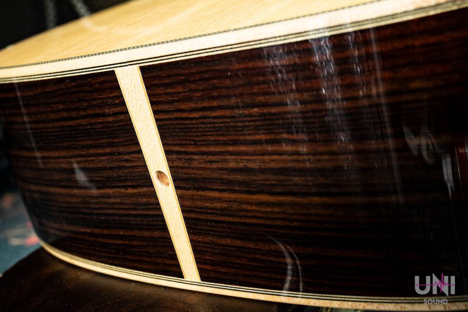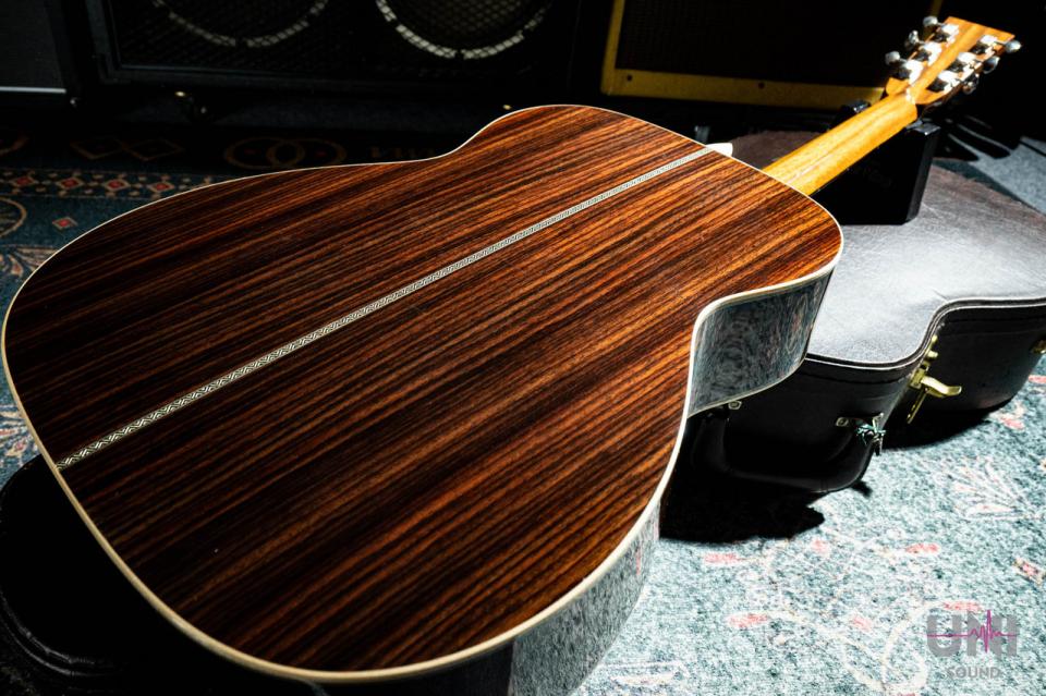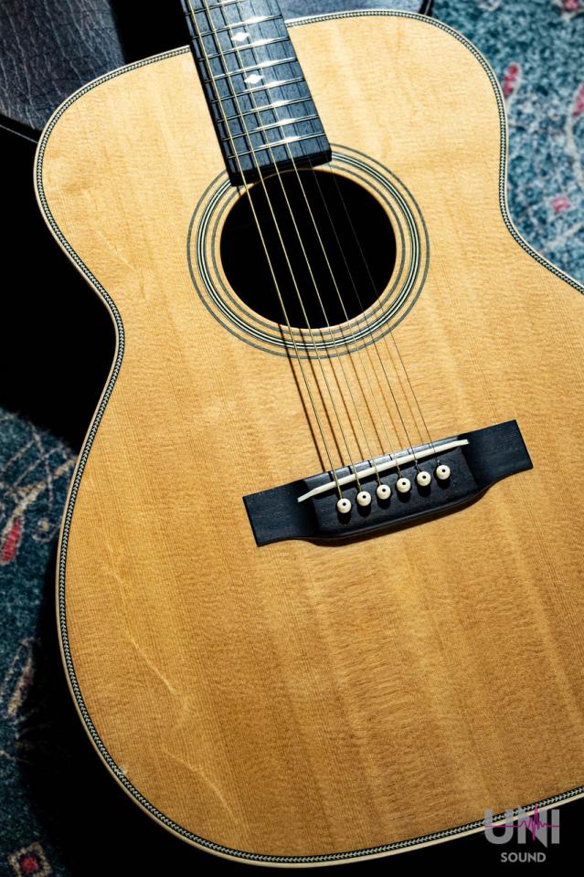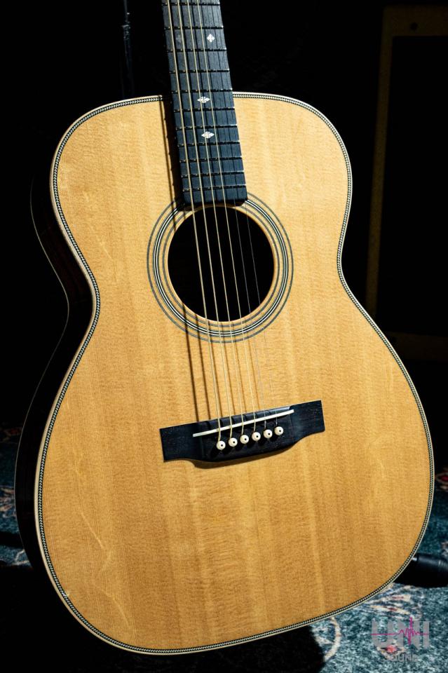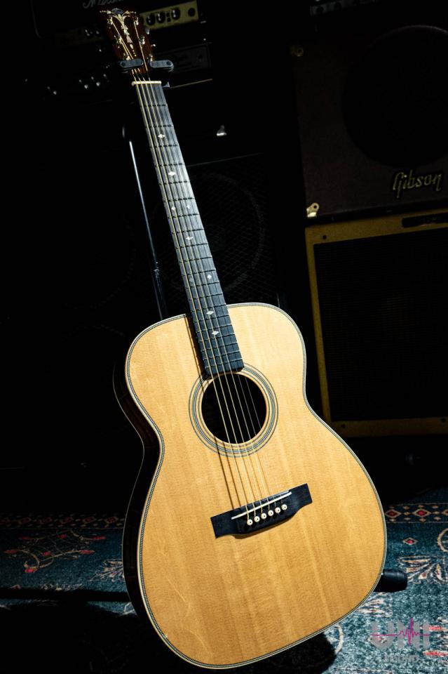 ヘッドのトーチインレイやボディのヘリンボーンバインディングなど、戦前の000-42をイメージしたルックスが特徴の1本。反応が早く、フィンガーピッキングからピック弾きまでバランス良く対応します。