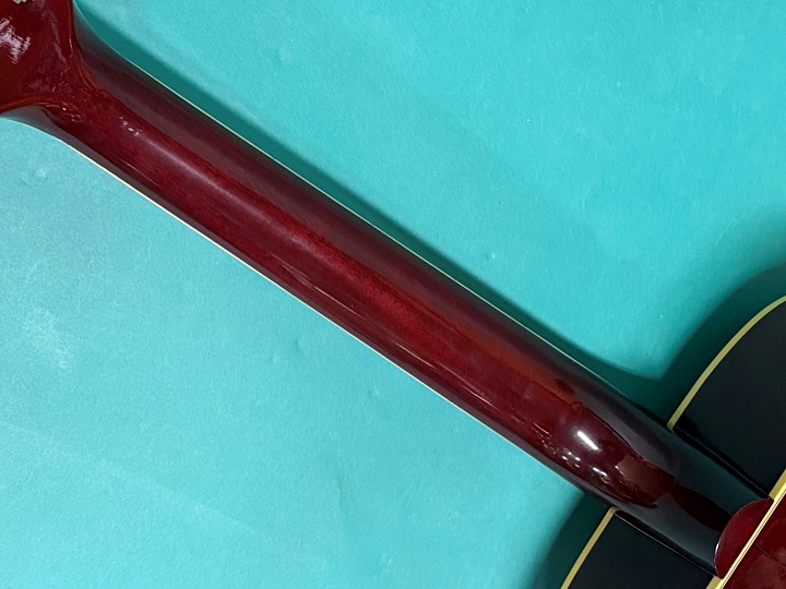 ボディトップはスプルース、サイドバックはマホガニー、指板はローズウッド、ブリッジもローズウッドです。クルーソンスタイルのオリジナルペグも、くすみはあるもののスムーズに動作します。1960年代初期のダークチェリーサンバーストのヴィンテージの雰囲気を再現したVCS(ヴィンテージチェリーサンバースト)フィニッシュが施されています。ナット幅は43.8mm、スケールは約628mm、レギュラーグリップのネックです。