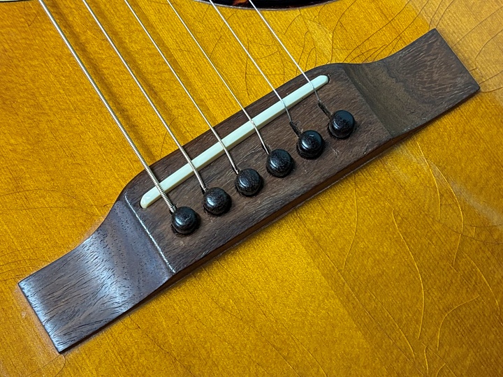 30年以上の経年によりこなれた箱鳴りで、粒立ちの良い高音とマホガニーボディらしい軽快でボリュームのある音色がバランス良く響きます。フィンガーピッキングでも各弦の分離感が良く、やや温かみのあるサウンドが心地良く鳴ります。