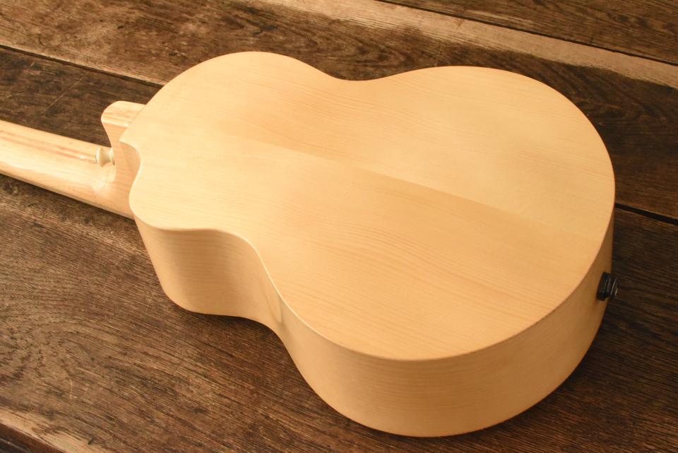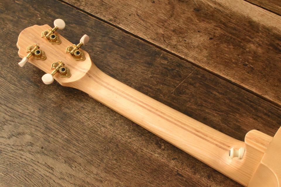 ボディ&ネックには北海道産のクロエゾマツを使用。現行モデルはネックとボディが一体整形のスルーネック構造を採用していますが、本器は一般的なウクレレ同様、ネックがボディにジョイントされる構造となっております。ボディ厚はくびれ部で約8.2cmと厚めのサイズが特徴です。指板&ブリッジにはイタヤカエデを使用しています。