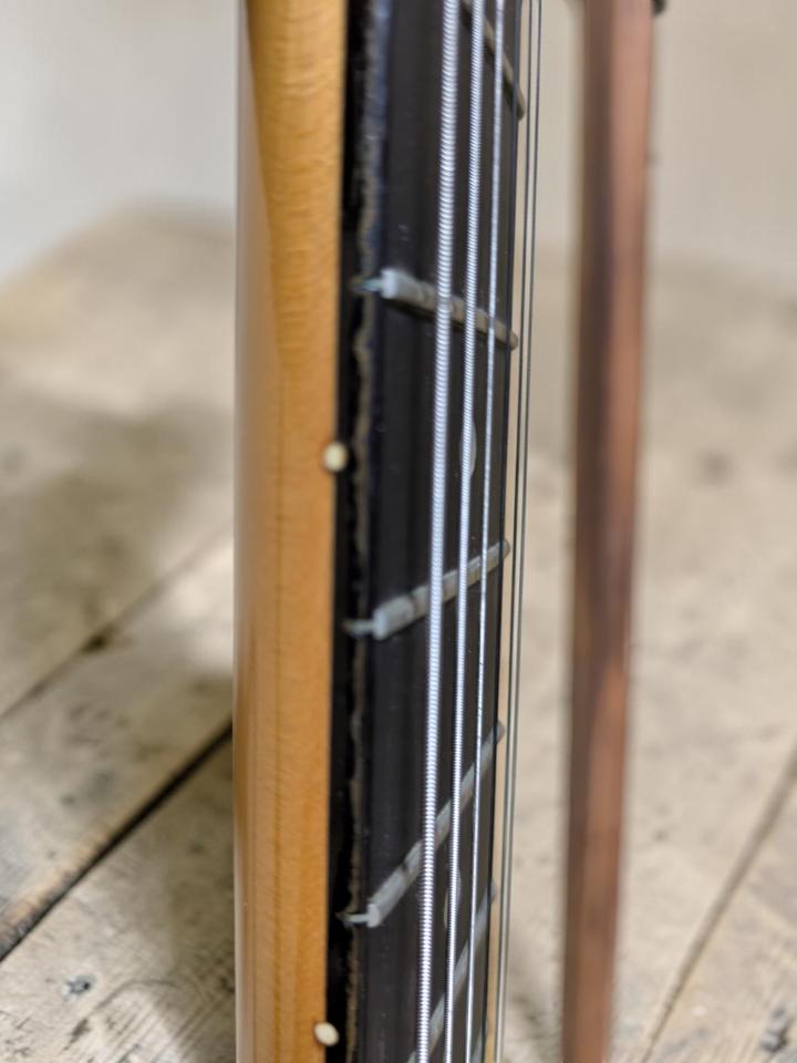 No Brand ながら非常に良い材を使っているように見えます。断定はできませんがボディはマホガニー系に見えます。ネックはメイプル&エボニー指板と思われます。