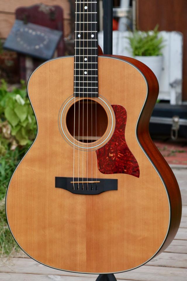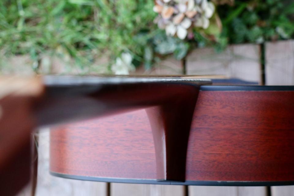 ♪1997年に生産されたテイラーの414モデルで、トップはややベアクローと呼ばれる杢が入った上質なスプルースで、サイド&バックには美しい木目のマホガニーが採用されています。このモデルはカッタウェイとピックアップは備えていないオーソドックスなアコースティックモデルで、小振りなボディサイズながらふくよかな中低音域とブリリアントな高音域が魅力です。