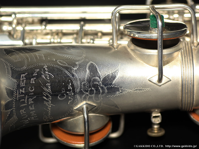今回のこちらのサックスはトーンホールの仕様や全体的な特徴からMartin製のWurlitzerサックスと思われます。ステンシルサックスのシリアルナンバーの多くはベースとなった元々のブランドのシリアルナンバーとは別の形態となっていたようで、番号の管理などに関する詳細な資料なども皆無に等しいため年代の特定が困難であることが多いです。こちらのサックスはHigh E、F、F#キーなどがなく構造的には古い年代のようで、Martinで言えば1920年代後半まであったHandcraftモデルのような古い年代のものと思われます。