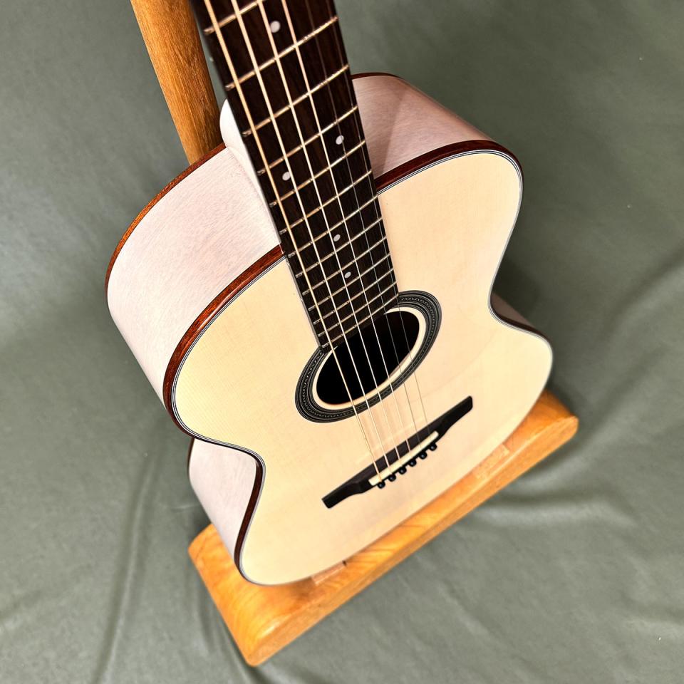ラインナップにあった時代の仕様に比べると、細かな点はアップグレードされていますが、アップチャージはさほどでもありません。小ぶりなギターですが14フレットジョイントという事で、演奏性にも優れています。専用で付属するハードケースも特注です。