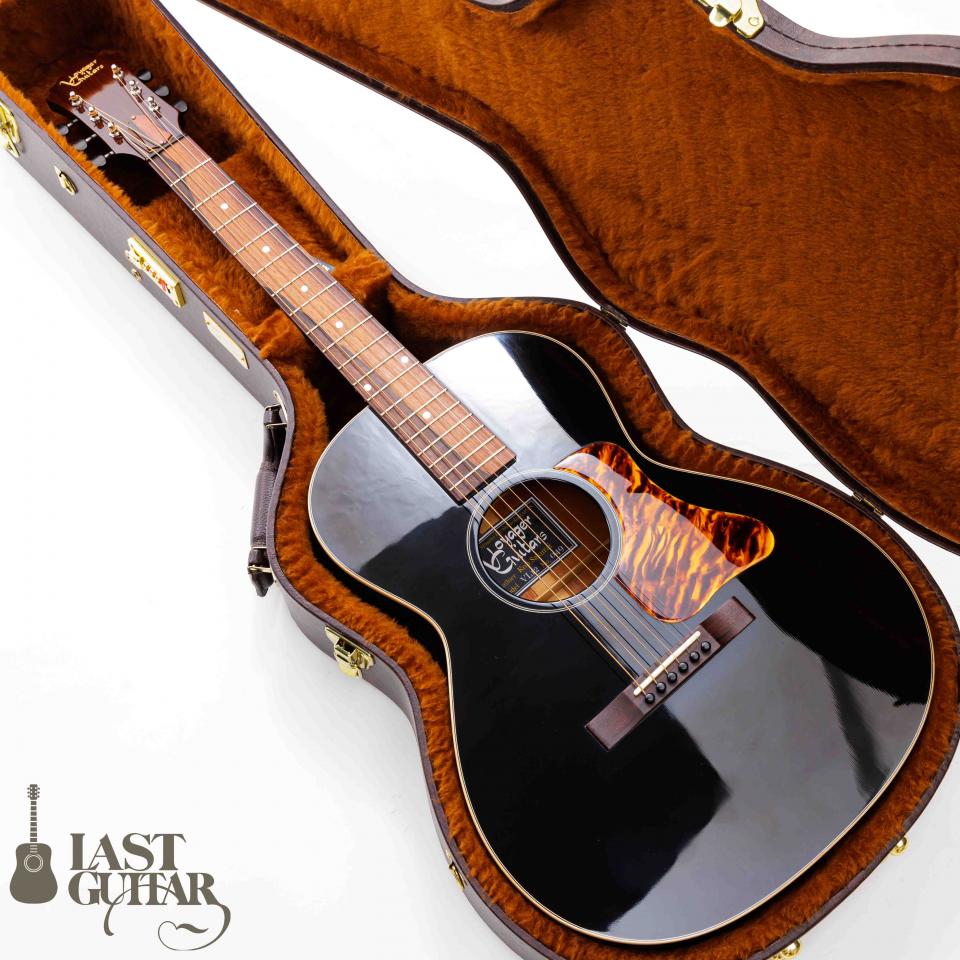本機VL12は、ギブソンHG-00をモチーフにしたトラッドスタイルモデルです。ブラックカラーにオリジナルのピックガードが映える美しいルックス。トップ材は、シトカスプルースとイングルマンスプルースの自然交配種であるルッツスプルース、サイド&バックは、ホンジュラスマホガニー、ホンジュラスマホガニーネック、マダガスカルローズウッドのフィンガーボード&ブリッジと贅沢なウッドマテリアル。ネックは、厚みのあるしっかりとしたグリップ感です。チューニングマシーンは、エボニーつまみのWaverly 4060がチョイスされており雰囲気にマッチしています。サウンドは、小振りながら材の組み合わせや12フレットジョイントなどによりふくよかで質感の良いフィールに仕上がっています。ケースは、掲載のハードケースが付属いたします。